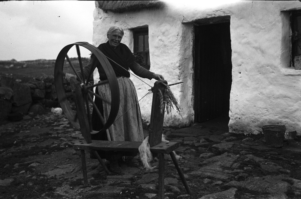 Photograph depicts a woman spinning on a Great wheel/Walking wheel in Connemara and it is from the www.duchas.ie website, The Photographic Collection:
